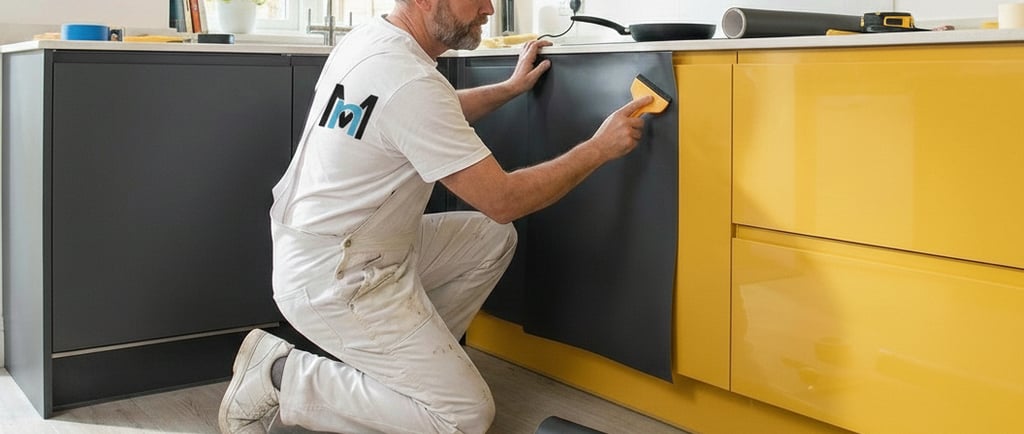 La pose de film adhésif demande une technique irréprochable. Pour éviter les bulles, les décollements aux angles et assurer une finition parfaite (notamment autour des poignées et des moulures), l'expertise d'un professionnel est indispensable. En tant qu'experts des surfaces et de la finition, nous préparons minutieusement les supports (dégraissage, ponçage léger si nécessaire) pour garantir une adhérence maximale.